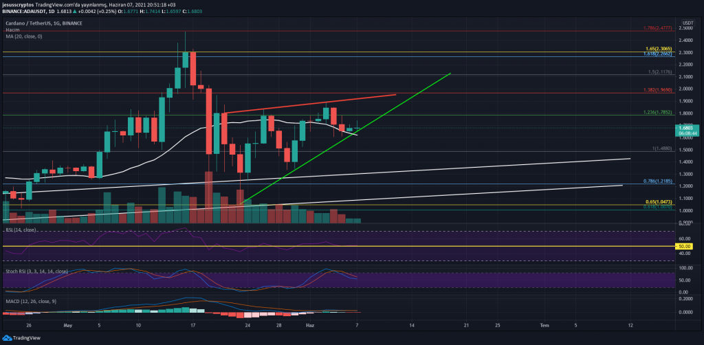Genellikle aşağı yönlü kırıldığı bilinen yükselen kama formasyonlarının burada alt desteği olan 1.621 doları (MA20) aşağı yönlü kırarsa, ADA’nın 1.488 ve 1.218 dolar desteklerine doğru kademeli bir düşüş yaşadığını görebiliriz. Ancak bu destek yükseliş yönlü bir hareketin gelmesi, 1.785 dolar direncinin geçilmesini ve kamanın üst kanadına yükselişi sağlayabilir.