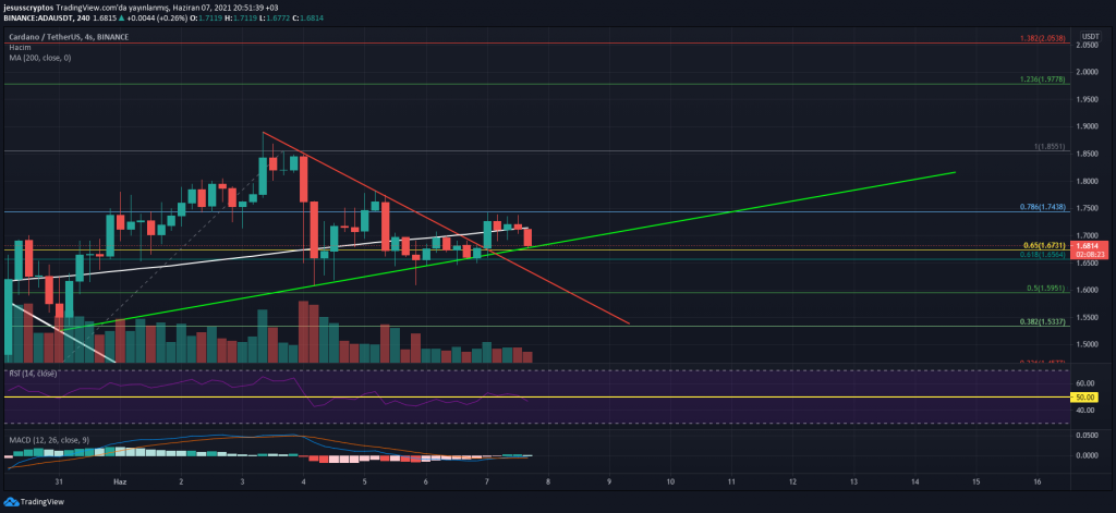 3 Haziran’dan gelen kısa vadeli düşüş trendini yukarı yönlü kırmayı başaran ve MA200 üzerine çıkan ADA’nın buradaki macerası uzun sürmedi. Şu saatlerde Bitcoin’de (BTC) yaşanan düşüşle 1.714 dolara denk gelen MA200 seviyesi altına gerileyen ADA, 1.656 – 1.673 dolar ve yeşil kısa vadeli trend desteği üzerinde tutunmayı başarıyor.