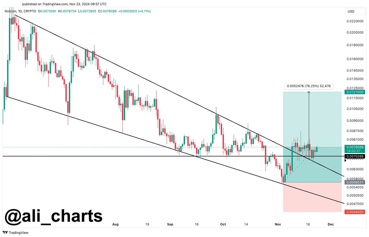“Notcoin (NOT) düşen kama formasyonundan çıktık. NOT şuan itibariyle ise iki haftadır konsolide oluyor. Bence ivme kazanıyor ve 0,012 dolara yükselmek için gereken likiditeyi topluyor!”
