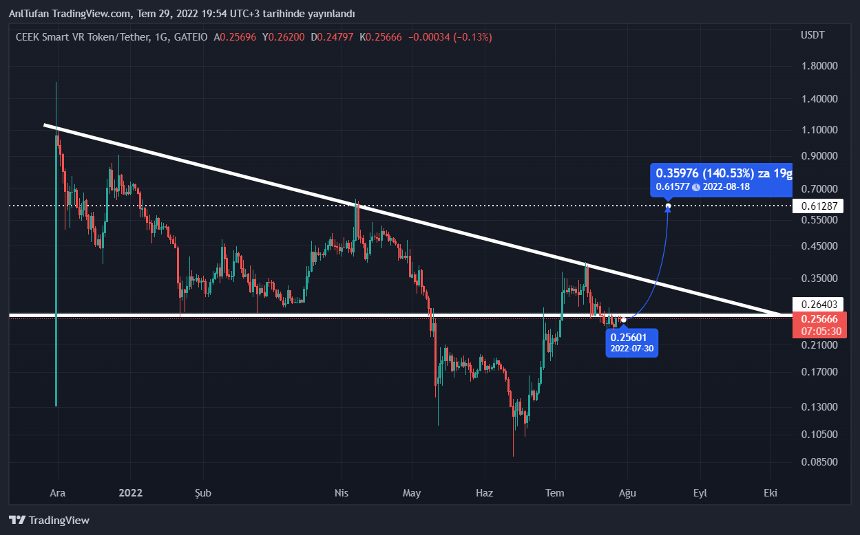 Geçtiğimiz günlerde çok sert bir şekilde yükseliş yaşayan CEEK VR, son süreçte ise beklentileri karşılayamadığı görülüyor. Halen 0.26 dolar direncinin altında bulunan CEEK, ilerleyen günlerde bu seviyeyi aşabilir.