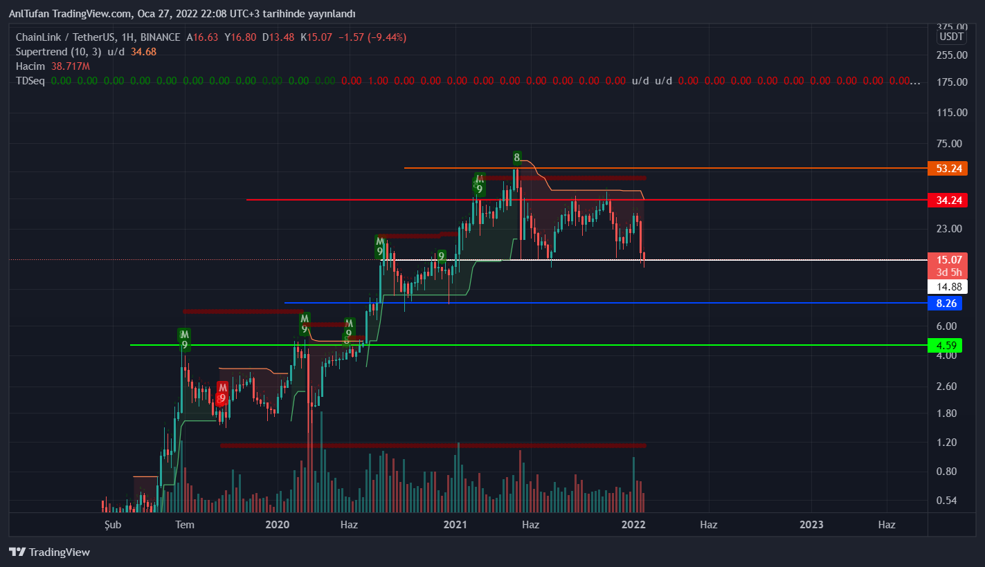 Uzun vadeli tablomuzda Chainlink’e baktığımız takdirde, 14.88 dolar seviyesinin kritik bir destek olduğunu görebiliyoruz. Bu destek seviyesi altındaki haftalık kapanışlar 8.20 dolar desteğine doğru bir yolculuk başlayabilir.