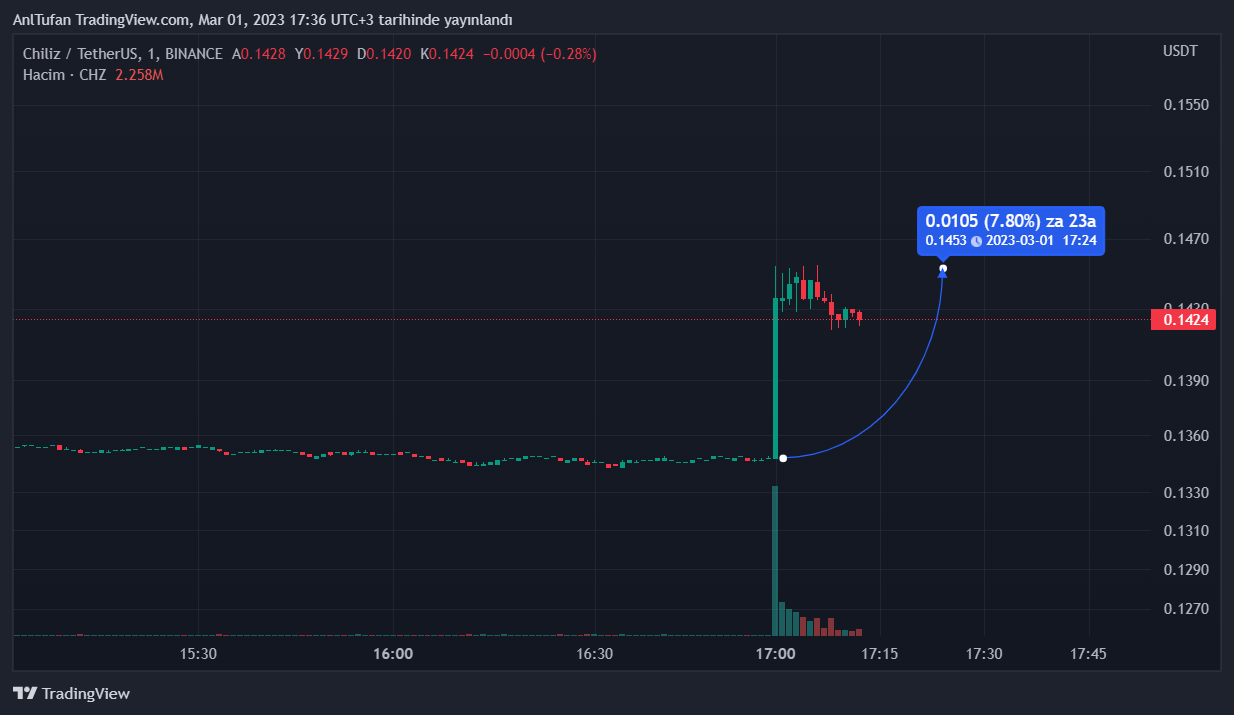 Bu son duyuruların ardından harekete geçen CHZ, dakikalar içerisinde yüzde 8’lik bir yükseliş yaşadı. Popüler altcoin ilerleyen saatlerde yükselişlerine devam edecek mi? merak konusu..