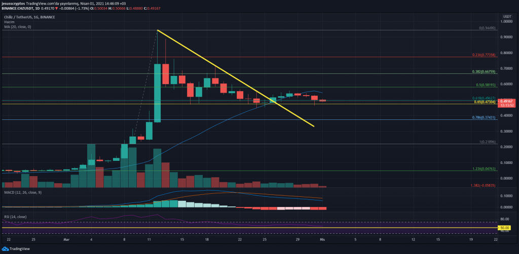 Yaptığı fan token açıklamaları ve %2000’in üzerindeki yükselişle Şubat – Mart ayı aralığına damgasını vuran Chiliz (CHZ), yayın saati itibariyle ATH seviyesi olan 0.9449 dolardan %50 aşağıda 0.491 dolar üzerinde alıcı buluyor.