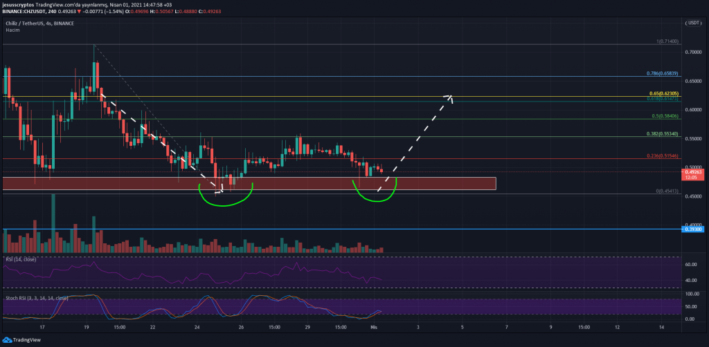 Günlük grafikteki felaket tellallığından sonra 4 saatlik grafiğimizde kısa vadede CHZ, küçük de olsa yatırımcılarını umutlandırıyor. Tam net olmamakla birlikte grafikte bir ikili dip formasyonu oluştuğu tahmin ediliyor. CHZ fiyatının bu formasyonu koruması ve 0.461 – 0.482 dolar aralığı altına inmemesi durumunda yükselerek 0.614 – 0.623 dolara doğru ilerlemesi bekleniyor.