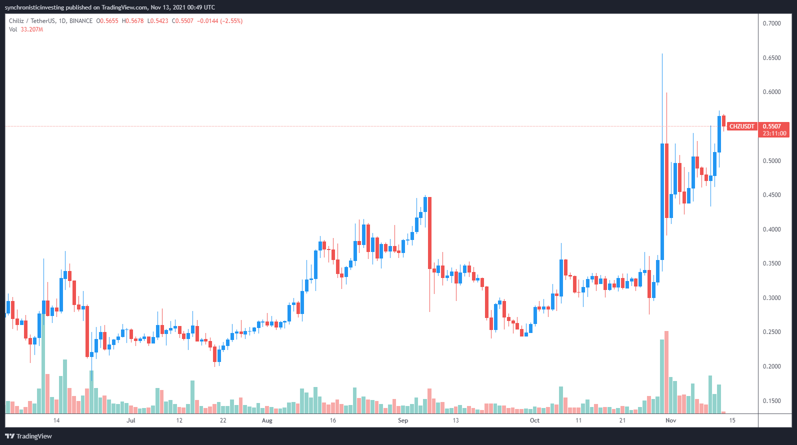 Chiliz (CHZ) 29 Eylül tarihinde 0.243 dolara düşmesinden bu yana 31 Ekim tarihi itibarı ile %170 bir artış yaşayarak 0.657 dolara ulaştığı görülüyor. Ayrıca, son gelişmelerin de etkisiyle CHZ fiyatı yeniden yukarı yönlü bir ivme kazanmış durumda.