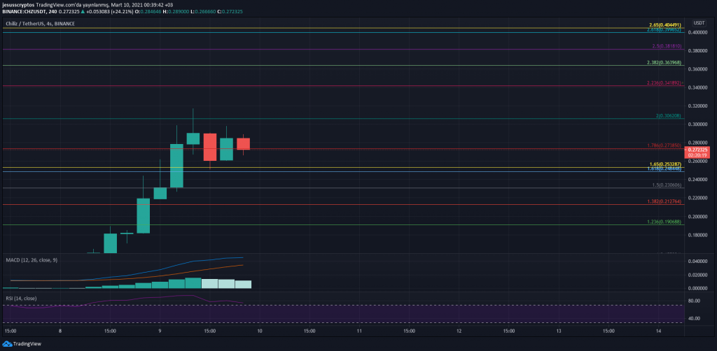 CHZ, 7 Mart günü %25’le başlayan yükseliş furyasının devamında %180’e kadar bir yükseliş gerçekleştirdi. Bu yükselişlerin ardından 4 saatlik grafik üzerinde uygulanan fibonacci düzeltmesi doğrultusunda, fiyatın önemli bir alan olan 0.248 – 0.253 dolar aralığı üzerinde yer aldığı görülüyor.