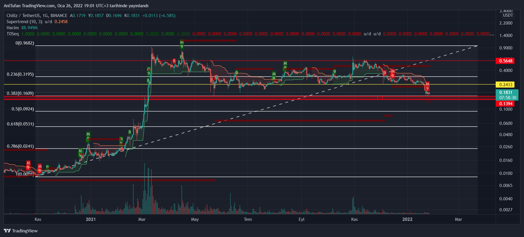 Yayın saati itibariyle 0.1820 dolar seviyelerinde bulunan CHZ, son 1 hafta içerisinde %40’lık bir düşüş yaşadı. 0.382 fibonacci seviyesi olan 0.1609 dolar desteğinde tutunmayı başaran CHZ bu seviyenin kaybedilmesiyle büyük bir çöküş yaşayabilir.