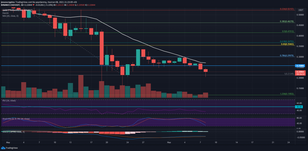 Düşüş sürecinde 0.164 dolarlık dip seviyesini gördükten sonra yükselen ve bu yükseliş sürecinde MA20 seviyesine takılan CHZ, bugünkü Bitcoin (BTC) düşüşüyle birlikte hızla 0.2135 dolarlık önemli seviye altına geriledi. Şimdilik BTC tarafında da görülen toparlanmayla birlikte CHZ’nin de yükseldiği görülürken mum kapanışı açısından 0.2135 doların kaybedilmesinin CHZ için oldukça tehlikeli olduğu belirtiliyor.
