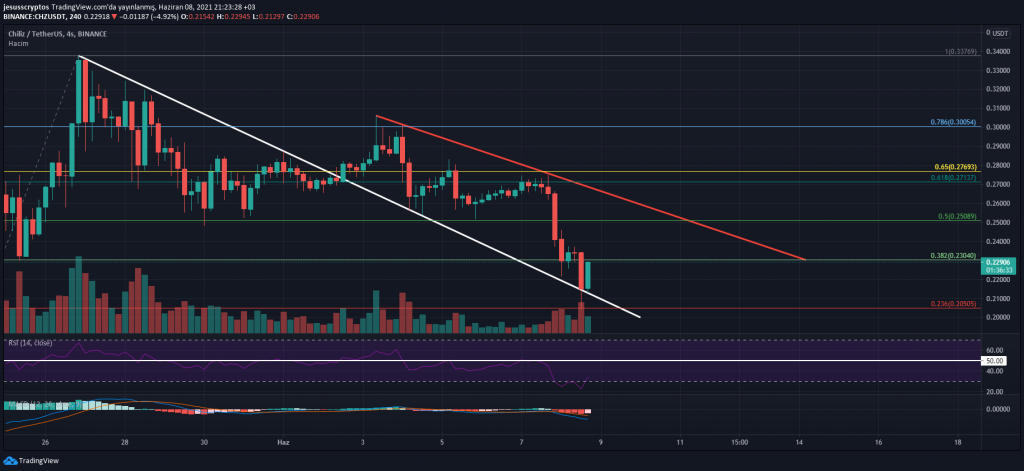 4 saatlik zaman diliminde 26 Mayıs 23:00 mumundaki 0.3377 dolarlık zirveden gelen beyaz düşüş trendini kırdığı görülen CHZ, daha önce retestini yaptığı bu düşüş trendinden yeniden tepki alıyor.