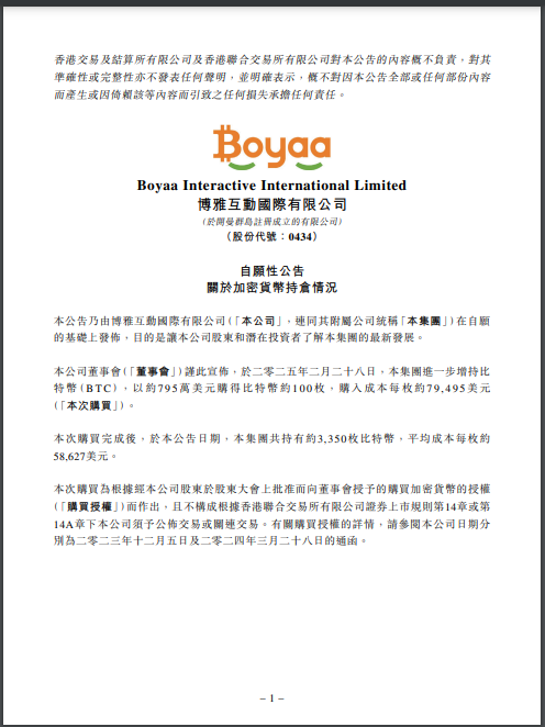 Kısa bir süre önce gelen bilgilere göre ise Çin merkezli bir oyun şirketi olan Boyaa Interactive, yeni Bitcoin (BTC) satın alımı gerçekleştirdi. Bu şirket geçtiğimiz dönemlerde de kademe kademe BTC satın alımları yapmıştı.