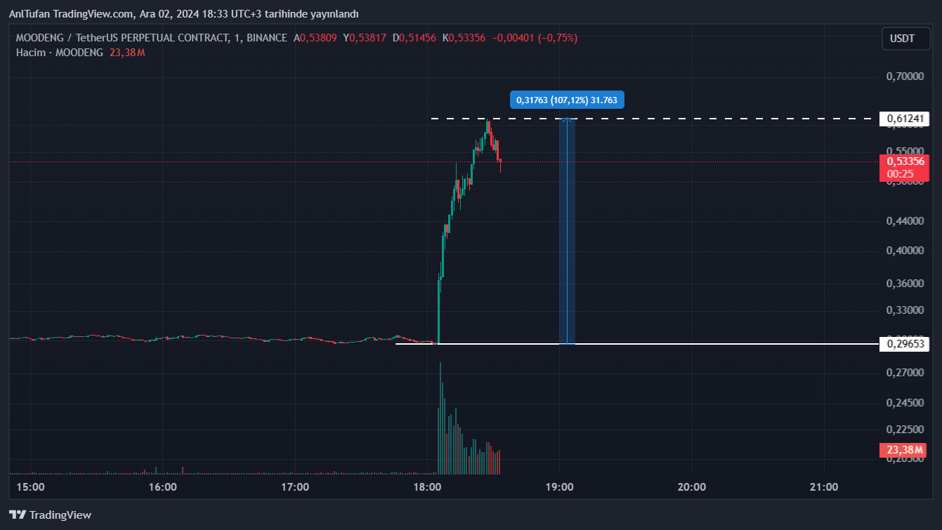 Son gelen haberler MOODENG’de rallinin başlaması için yeterli oldu. Çok kısa bir süre içerisinde harekete geçen MOODENG, dakikalar içerisinde %100’den fazla artış yaşadı.