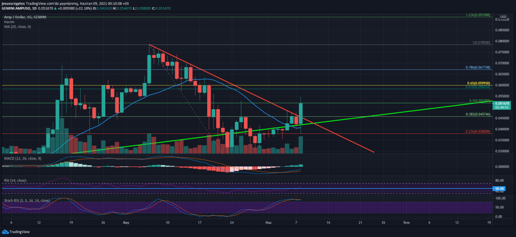 6 Mayıs günü yaptığı 0.0785 dolarlık zirveden gelen düşüş trendi kuvvetli bir şekilde kırdığı görülen AMP, 0.052 dolar direncinde satış baskısıyla karşılaşıyor. Şimdilik yükseliş yönlü hareketin gelmesi için kırmızı trend çizgisi üzerinde kapanış yapması yeterli gözüyle bakılan AMP’nin 0.052 dolar direncini zorlaması, fiyattaki yükseliş momentumunun önümüzdeki günlerde daha fazla artması bekleniyor.