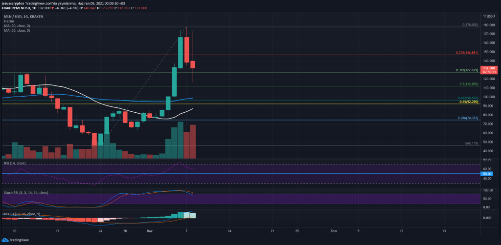 Uzun bir süre “AYI” etkisinden çıkamayan Melon protokolü, 2020 yılı yazındaki DeFi furyasıyla beraber yerini Enzyme’e bırakıyor. Bu değişimin ardından üzerindeki “AYI” etkisini atmayı başararak yükselişe başlayan MLN, son bir senede 43x’lik bir yükseliş gördü. Bu yükseliş sonrasında son 24 saatte %25’lik düşüş yaşayan MLN, yayın saati itibariyle 130 dolar üzerinden işlem görüyor.