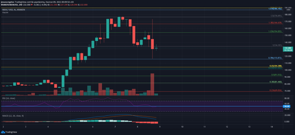 Günlük grafikteki gibi 4 saatlikte de bir süre RSI tarafında overbought bölgesinde kalan ve ardından fiyatta gerilemenin yaşandığı görülen MLN, 134.1 dolarlık önemli seviye altında fiyatlanmaya devam ediyor.