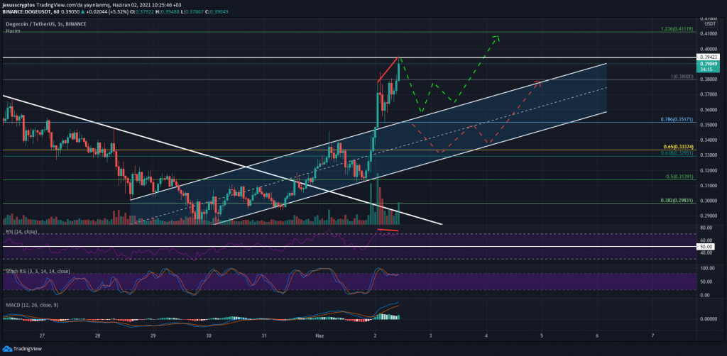 Adeta DOGE’a bir can suyu olan bu %8’lik yükseliş, giderek bir FOMO yani fırsatı kaybetme korkusuna dönüşerek %25’i aşan bir yükselişi tetikledi. Saatlik grafikte bir süredir yükseliş kanalı içerisinde olan DOGE, bu etkiyle birlikte kanal formasyonunu kırarak 0.412 dolar direncine doğru yükseliyor.