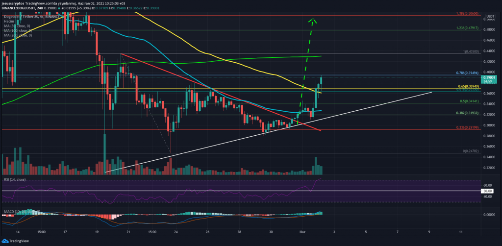 Dün gelen haberler birlikte geri çekildiği beyaz destek çizgisinden hızla yükselişe geçen DOGE, fibonacci düzeltmesindeki önemli 0.363 – 0.369 dolara aralığı üzerine çıkmış bulunuyor. Bu alan üzerinde iki mum kapanışı yaptığı görülen DOGE için burası artık önemli bir destek seviyesi olarak nitelendirilebilir. Ayrıca MA100’e denk gelen 0.36 doların da bu bölgeyi desteklediği görülüyor.