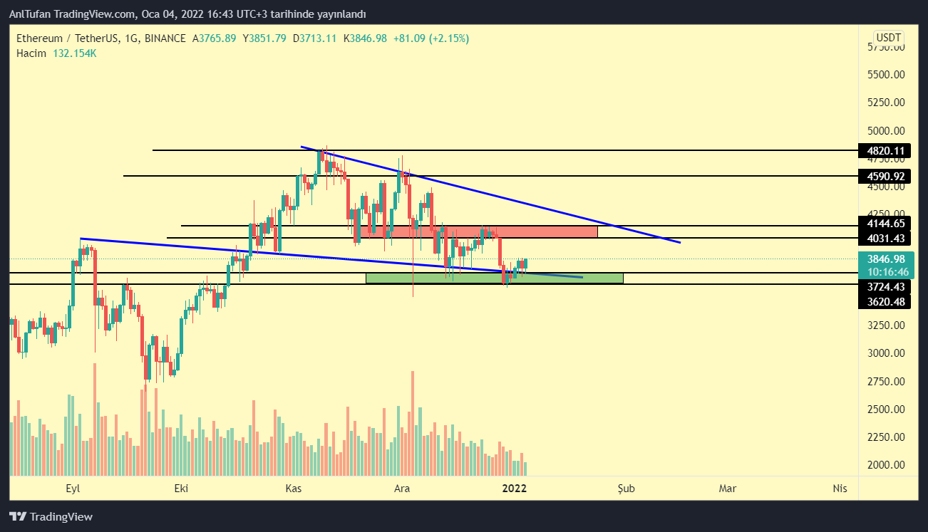 3.600 – 3.750 dolar destek seviyesi ve trend çizgisinden destek alan Ethereum tekrardan yavaş yavaş üst dirençleri hedeflemeye başladı. 4.030 – 4.150 dolar aralığının sert direnç olduğu Ethereum’da, 4200 dolar üzeri kapanışlar sert yükselişler öncesi akümüle olarak belirtilmekte.