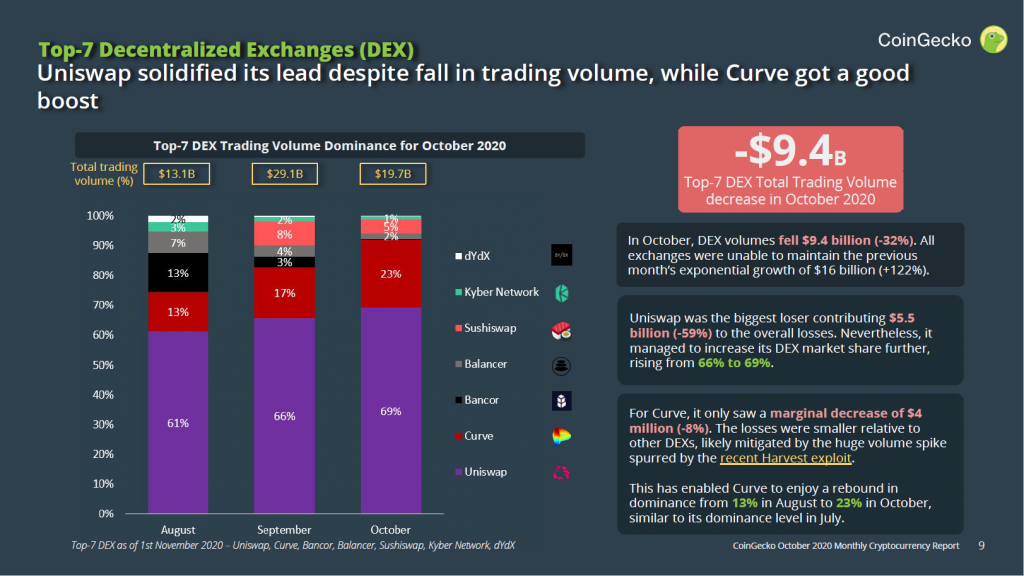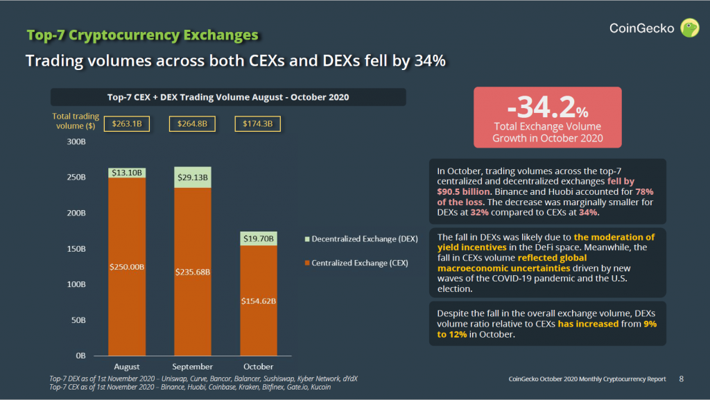 Dijital para birimi fiyatlarının, proje bilgilerinin bulunduğu veri platformu olan Coingecko tarafından yayınlanan Ekim ayı kripto raporuna göre, en hacimli ilk yedi “merkezi olmayan borsa (DEX)” 9.4 milyar dolarlık işlem hacmi kaybetti.
