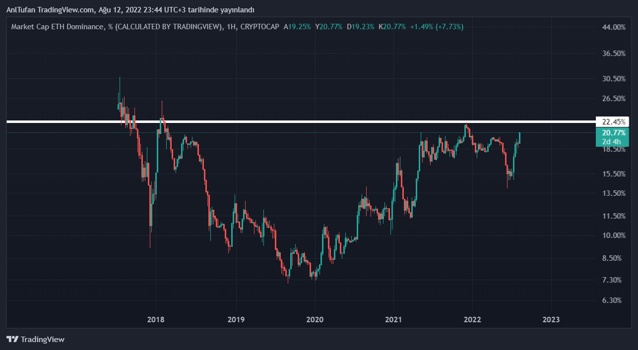 Son dönemlerde devasa bir şekilde artışa geçen Ethereum Dominance tablosu, ilerleyen süreçte düşüşe başlamasıyla birlikte altcoinlerin yükselişe başlamasını sağlayabilir.