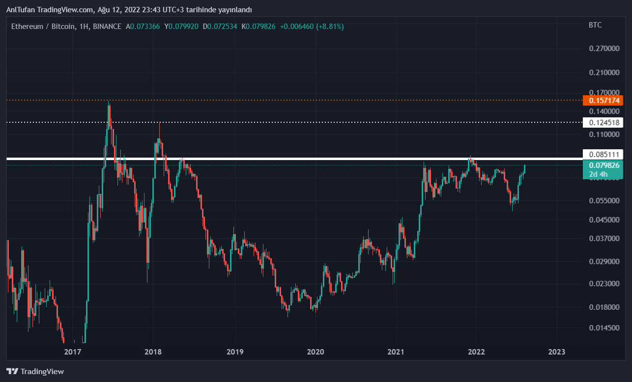 Bitcoin paritesinde neredeyse 2021 yılındaki zirve seviyesine ulaşan ETH, 0.085 BTC direncini kırmasıyla birlikte kısa bir süre içerisinde 0.12 – 0.15 BTC dirençlerini hedeflemesi bekleniyor.