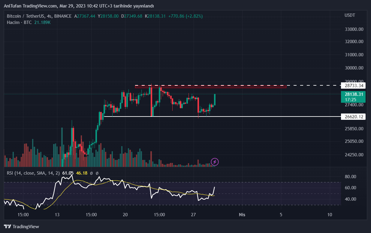 Son 24 saat içerisinde yüzde 3’den fazla yükseliş yaşamayı başaran Bitcoin, şuan itibariyle 28.800 dolar direncini hedeflemiş gibi gözükmekte. Önümüzdeki saatlerde BTC’nin bu direnç seviyesine de ulaşacağı tahmin edilmekte.