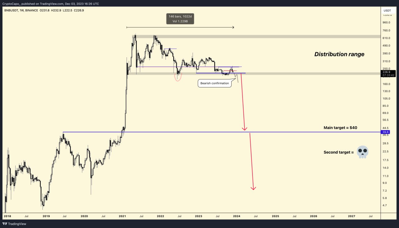 Crypto Capo ise Binance’in yerel kripto para birimi BNB‘nin dev bir çöküş yaşamasını beklemekte. Capo’ya göre an itibariyle 230 dolar seviyesinde yer alan BNB, 40 dolara kadar gerileyecek.