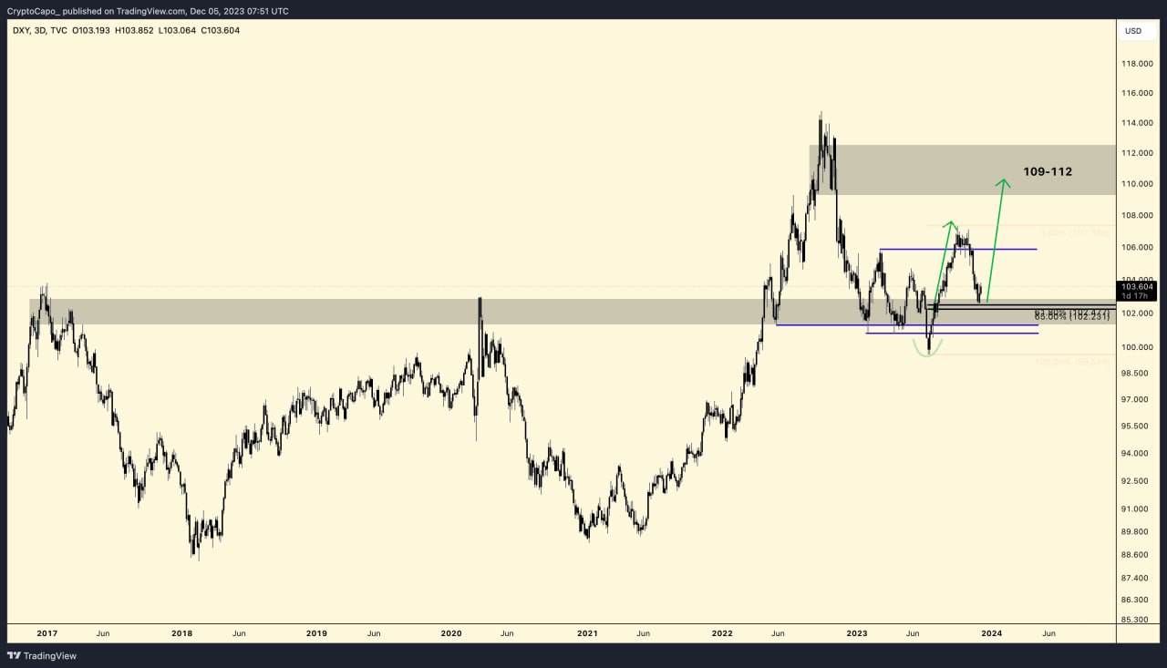 Crypto Capo, Bitcoin ve altcoin’lerdeki bu çöküş beklentisinin aksine ABD Dolar Endeksinde (DXY) yeniden sert yükselişlerin yaşanacağını tahmin etmekte.