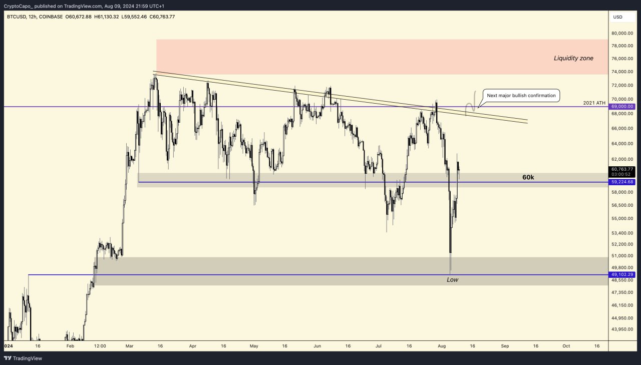 Son paylaştığı analizinde Bitcoin’in 60 bin doları geri kazanmasının çok önemli olduğunun altını çizen Capo, BTC hakkında şu sözleri aktardı: