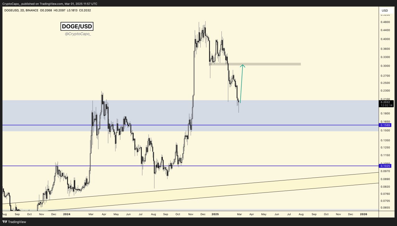 - Crypto Capo an itibariyle 0.203 dolardan işlem gören DOGE’nin yakında ortalama %50’lik bir sıçrama gerçekleştrerek 0.30 – 0.32 dolar seviyelerine kadar yükseleceğini düşünüyor.