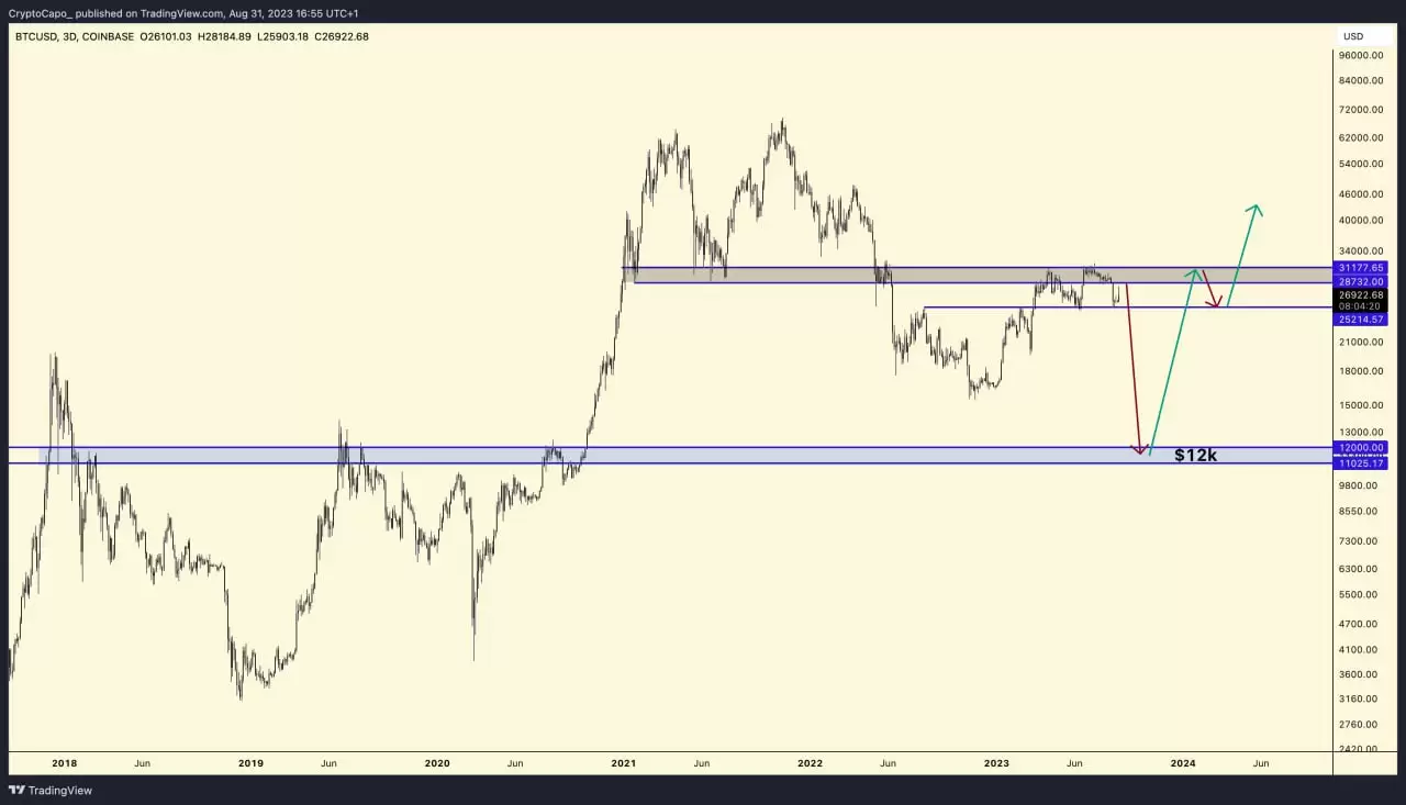 Popüler analist bugün itibariyle yeni bir grafik daha paylaştı. Capo BTC’nin ilerleyen süreçte 12 bin dolara düşeceğini ve 2024’ün başlamasıyla birlikte sert yükselişler yaşayacağını düşünüyor.