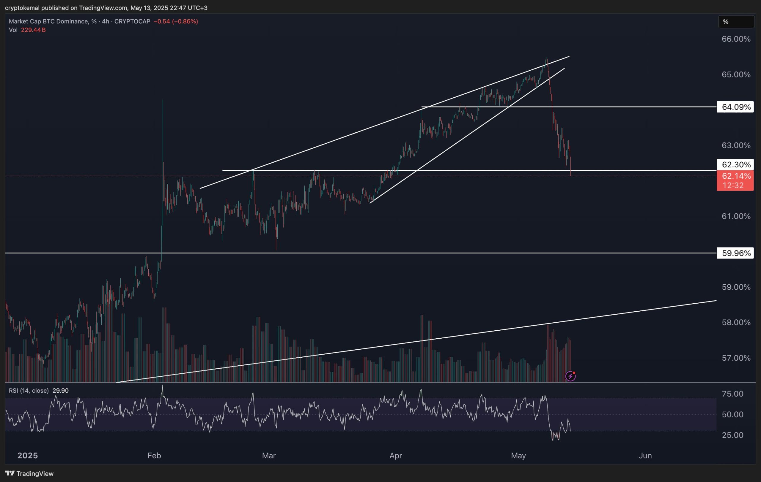 Türk kripto para yatırımcılarının yakından takip ettiği bir isim olan Crypto Kemal, kısa süre önce piyasaya dair görüşlerini paylaştı. Bitcoin (BTC) hakimiyeti tablosunun kritik bir destek noktasının altına sarktığını söyleyen Kemal, bu tabloda bir süre daha düşüşlerin devam edebileceğine inanıyor.