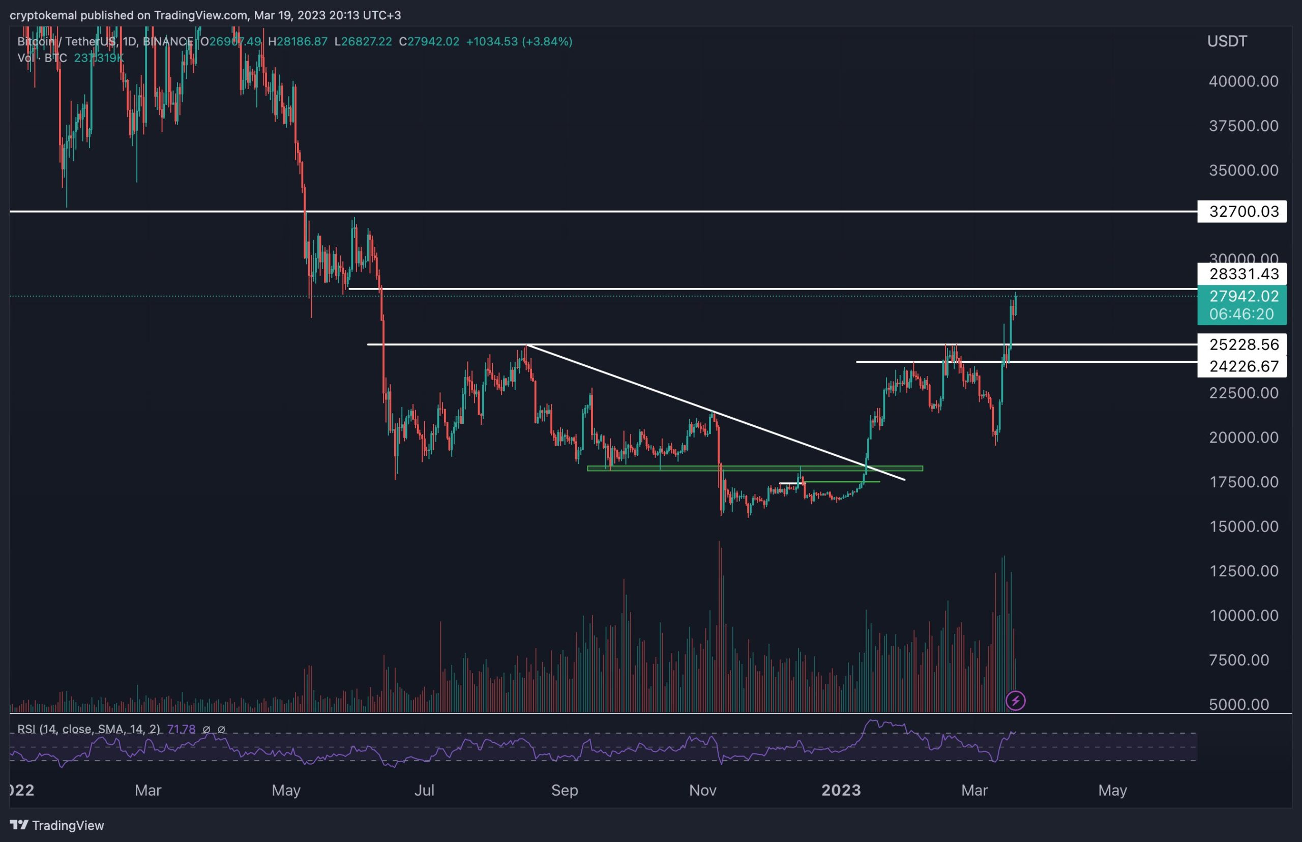 Son saatlerde lider kripto para birimi Bitcoin (BTC) tekrardan yükselişe geçerek, 28.200 dolar seviyelerine ulaşmış durumda. Bitcoin her ne kadar 28 bin doların üzerinde kalmayı başaramamış olsa da, bu direnç seviyesini zorlamaya devam etmekte.