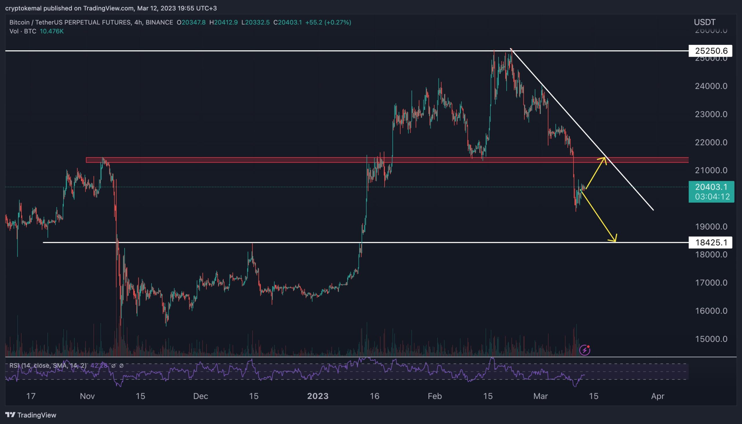 “bitcoin’in hangi yöne gideceği yarın yapılacak olan FED toplantısına bağlı. Bir bankacılık krizi yaşanır ve panik ortamı oluşur ise grafikte belirtiğim alt desteğe (18.425 dolar) kadar inebiliriz.”