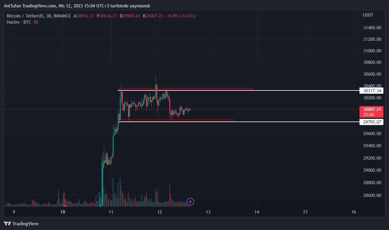 Son dönemlerde 29.800 – 30.300 dolar aralığında akümüle olan Bitcoin, ABD enflasyon verilerine göre bir kırılım gerçekleştirebilir gibi gözükmekte.