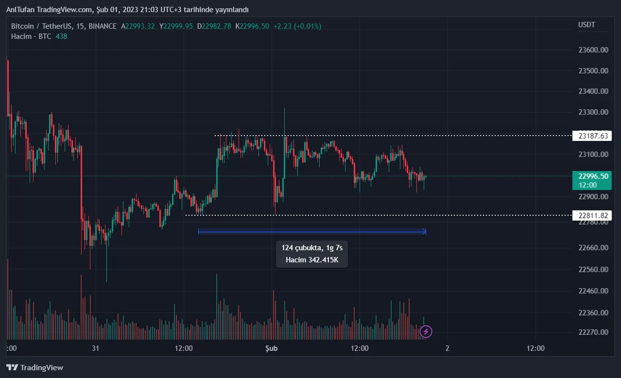 Bitcoin ve altcoin‘ler için çok kritik bir karar olarak görülen faiz artış oranının açıklanmasına sadece dakikalar kaldı. FED öncesi lider kripto para birimi Bitcoin’in (BTC) son durumuna baktığımızda ise 23 bin dolar seviyelerinde akümüle olmaya devam ettiği gözlenmekte.