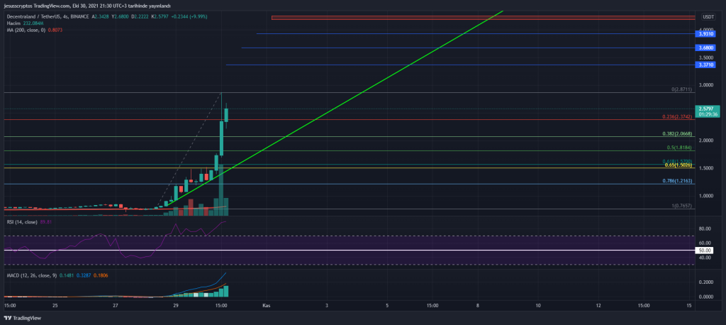 Bugünün mumunda da %123’lük bir yükseliş gösteren MANA, 2.871 dolarlık seviyeyi yeni ATH’ı olarak belirledi. Teknik açıdan böyle hızlı bir yükseliş sonrası günlük yerine 4 saatlik grafiği değerlendirdiğimizde RSI seviyesinin 89 civarında olduğu görülüyor. Bu da fiyatın aşırı alım bölgesinde olduğunu gösterirken kısa vadede geri çekilmelerin olabileceğine işaret ediyor.