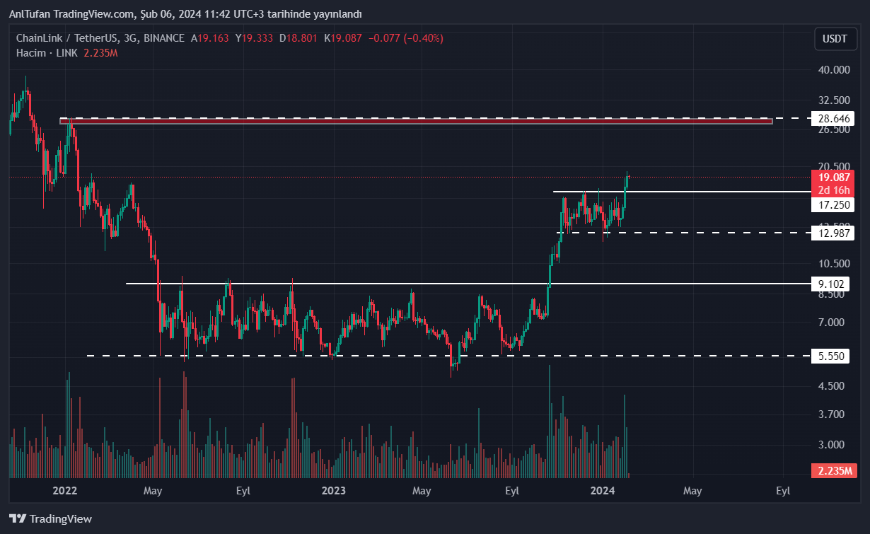 Chainlink (LINK) haberimizin yazıldığı esnada 19 dolar seviyelerinden işlem görüyor. LINK kısa bir süre önce kritik bir direnç noktası olan 17.3 doları kırmayı başardı.