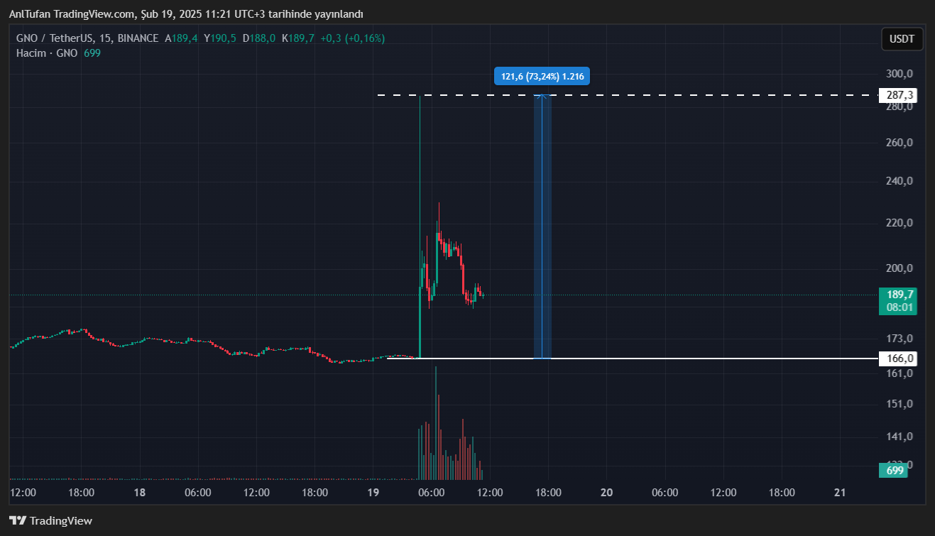 Bu listeleme duyurusu sonrasında GNO fiyatında ani yükselişlerin yaşandığı gözlemlendi. Çok kısa bir süre içerisinde 166 dolardan 287 dolara kadar %70’lik bir sıçrama gerçekleştiren GNO, sürecin ilerlemesiyle bu yükselişlerin önemli bir kısmını kaybetti.