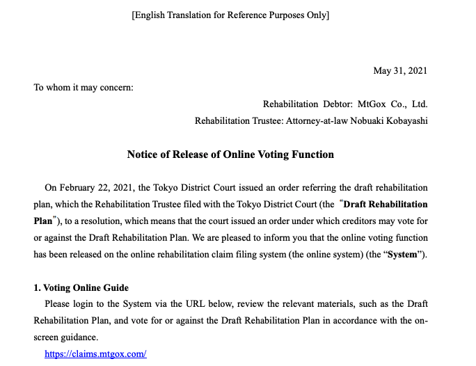 Mt. Gox borsasının borçlarını ödemesi için atanan kayyum heyetinin başkanı Nobuaki Kobayashi ise şimdi geri ödeme için oylamayı başlattı. 31 Mayıs tarihinde yapılan açıklamaya göre, kullanıcılara yönelik rehabilitasyon planının adımlarına dair oylama resmen başladı.