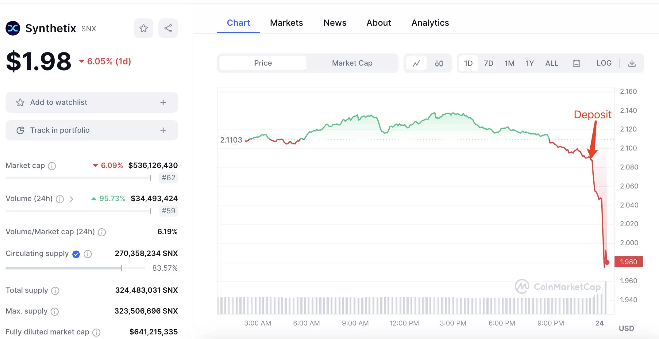 “Bir balina kısa bir süre önce 785 bin dolar zararla Binance‘e 2.015.264 adet SNX (4 milyon dolar değerinde) gönderdi ve sattı.