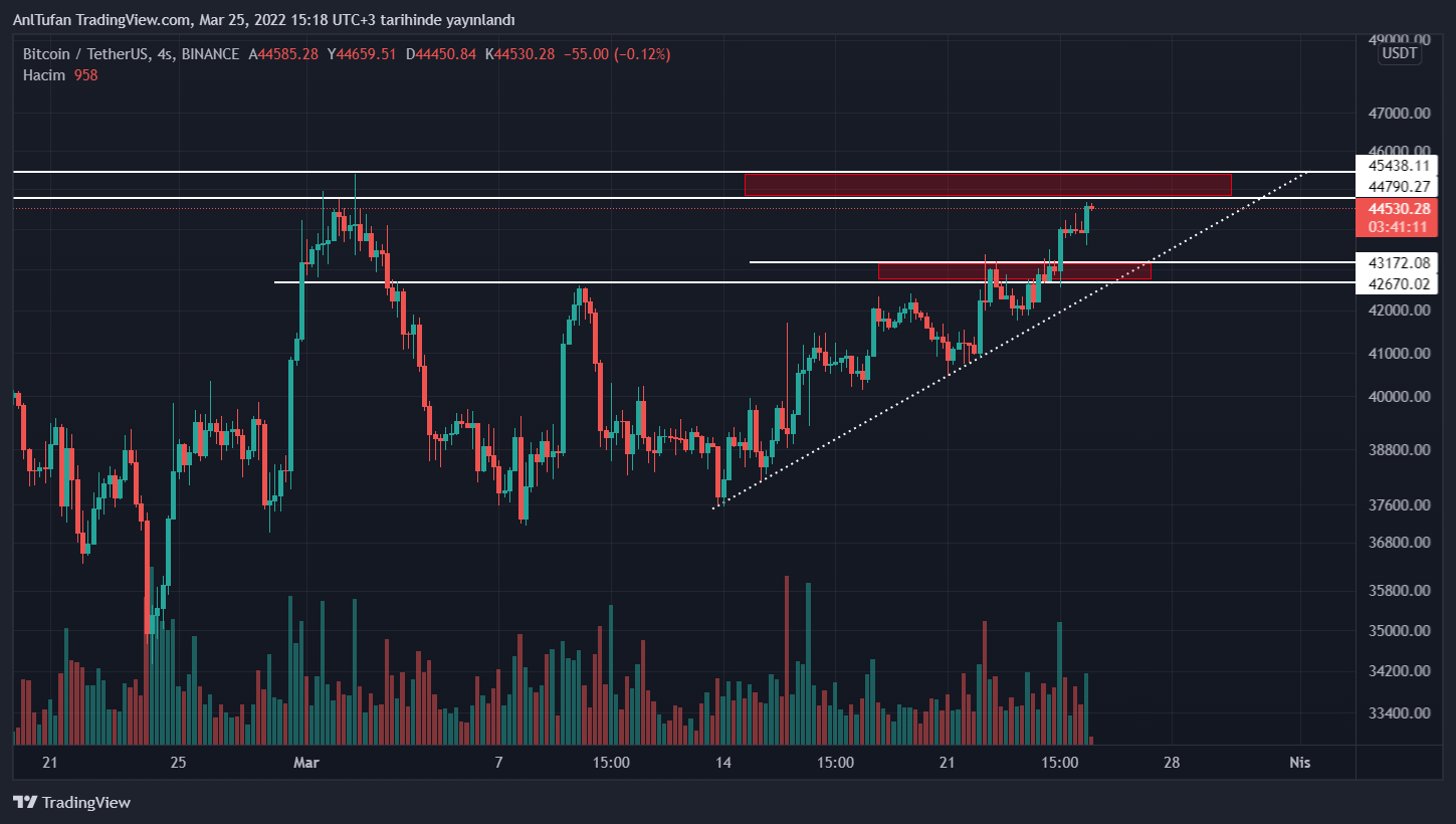 İlerleyen saatlerde bu direnç bölgesini deneyecek olan Bitcoin, 45.500 doların üzerine iğne atıp tekrar sert düşüşler yaşayabilir.