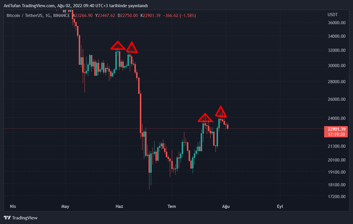 30 bin dolar seviyelerinde oluşan 2’li tepe formasyonunun ardından büyük bir çöküş yaşayan BTC, kısa bir süre içerisinde 17.700 dolar seviyelerine kadar değer kaybetti. Son günlerdeki hareketleri sonrası ise 2’li tepe formasyonu Bitcoin grafiği üzerinde yine yerini aldı.