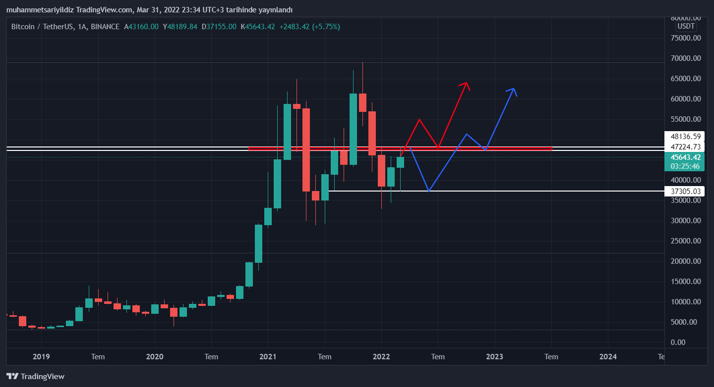 İlerleyen dönemler için önünde 2 tane senaryo bulunan Bitcoin, ilk senaryo özelinde grafiğimiz üzerindeki kırmızı ok işaretleri gibi 47.200 – 48.000 dolar direncini kırarak boğayı başlatacak.