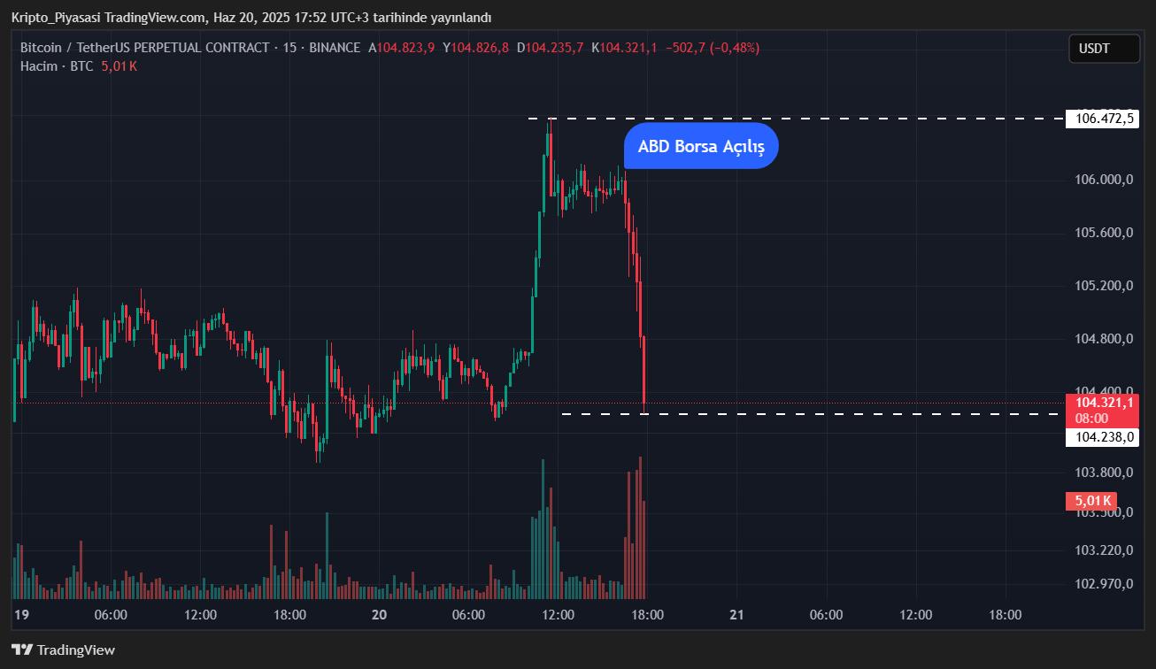 Bitcoin bugünkü yükselişleri ile birlikte 106.500 dolar seviyelerine ulaşmıştı. BTC son dakikalarda yaşanan düşüşler sonrasında ise 104.250 dolara kadar geriledi.