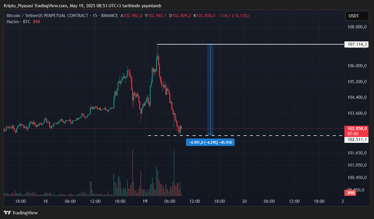 Haftalık kapanış sırasında 107.114 dolar seviyelerine kadar yükselen Bitcoin (BTC), bu son düşüşler neticesinde 102.500 dolar seviyelerine kadar geriledi.