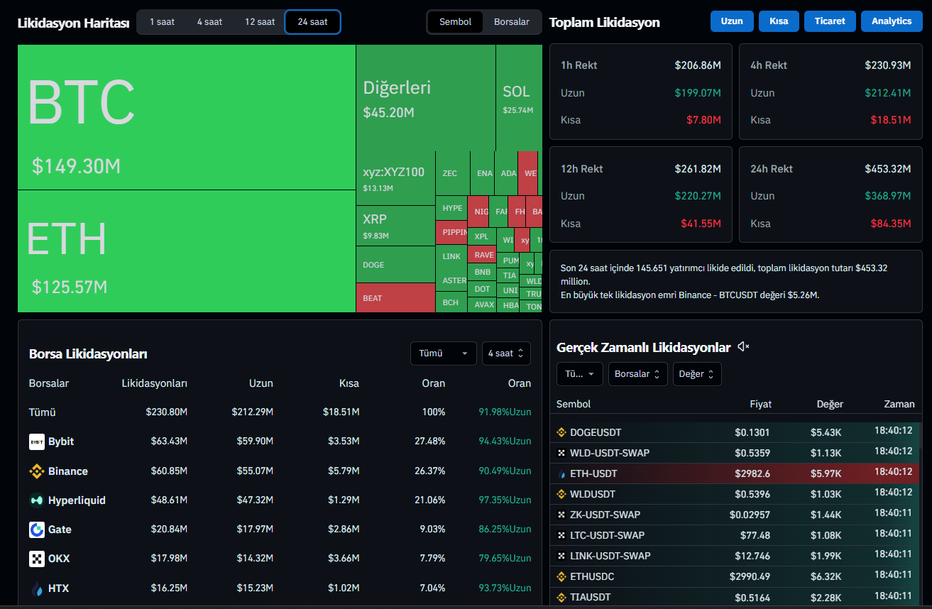 Kripto para piyasasındaki düşüşlerle likidasyon oranlarının da ciddi miktarda arttığı gözlemlendi. Son 24 saat içerisinde piyasada toplamda 453 milyon dolarlık pozisyon likit edildi.