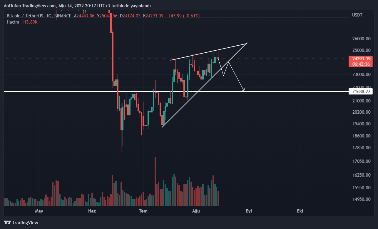 Bitcoin‘in günlük grafiği üzerinde bir bearish patern olan yükselen takoz formasyonunun oluştuğu dikkat çekiyor. BTC her ne kadar bu formasyonunun üst trendini zorlasa da, kırmayı başaramadı.
