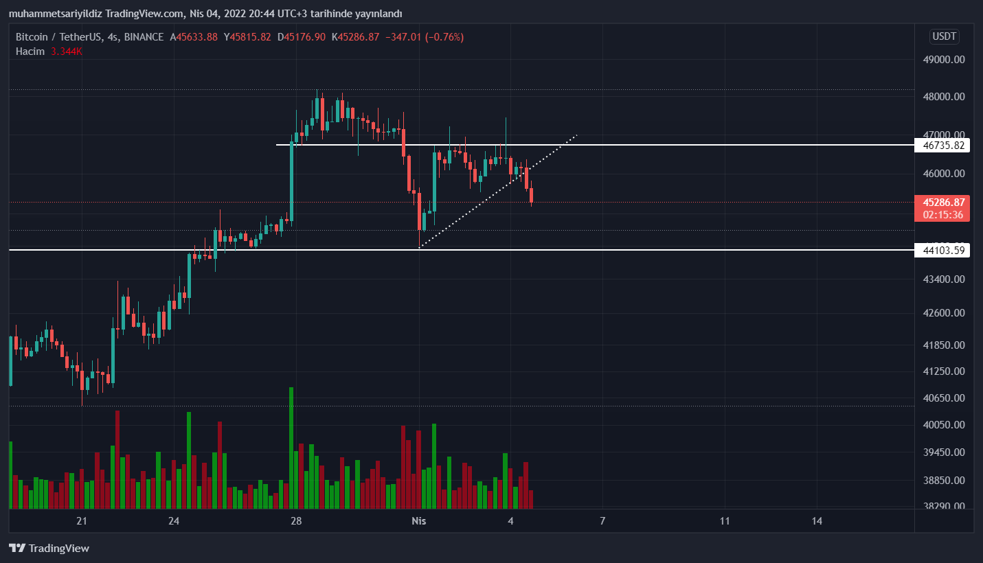 46.800 dolar bölgesinden sürekli reddedilen Bitcoin, an itibariyle oluşturmuş olduğu yükselen üçgen formasyonunu aşağı yönlü kırdı.