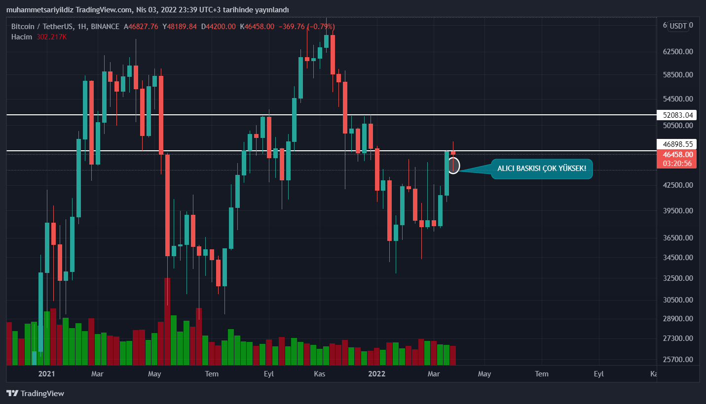 46.900 dolar direnci üzerinde gelebilecek olan kapanışlar Bitcoin‘in kısa süre içerisinde 52.000 dolar kritik direncine kadar değer kazanmasını sağlayabilir.