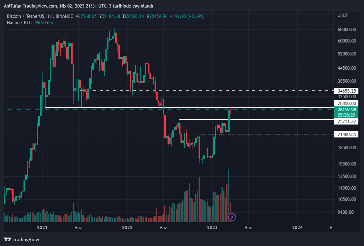 28.800 dolar direncini aşamaması halinde önümüzdeki hafta 25.200 dolar seviyelerine kadar gerileyebilecek olan Bitcoin, bu direnç noktasını aşması halinde ise 34.500 dolar direncini hedefleyebilir.